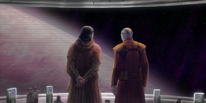 Revan e Malak, generali della repubblica, dal ponte della Testament guidano la flotta contro i mandaloriani.