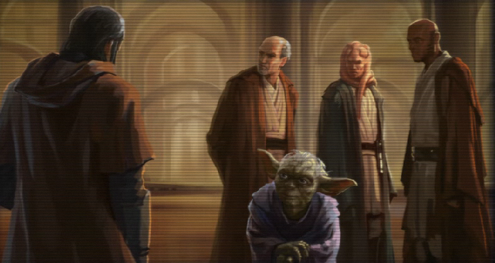 Revan davanti ai maestri Vrook Lamar,Vandar Tokare e Zhar Lestin